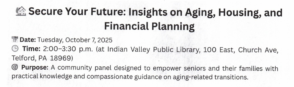 Are you concerned about the future as you age? Are you, or thinking you may soon be, a caregiver for an older loved one? Do you know someone who is? Please make the time on July 15 to grab free and important information from experts who can walk with you and your family through the care journey. NO SALES PITCHES, just good information. To register, email nmartinez@thebirchesatharleysville.com or call 215-541-3700.
